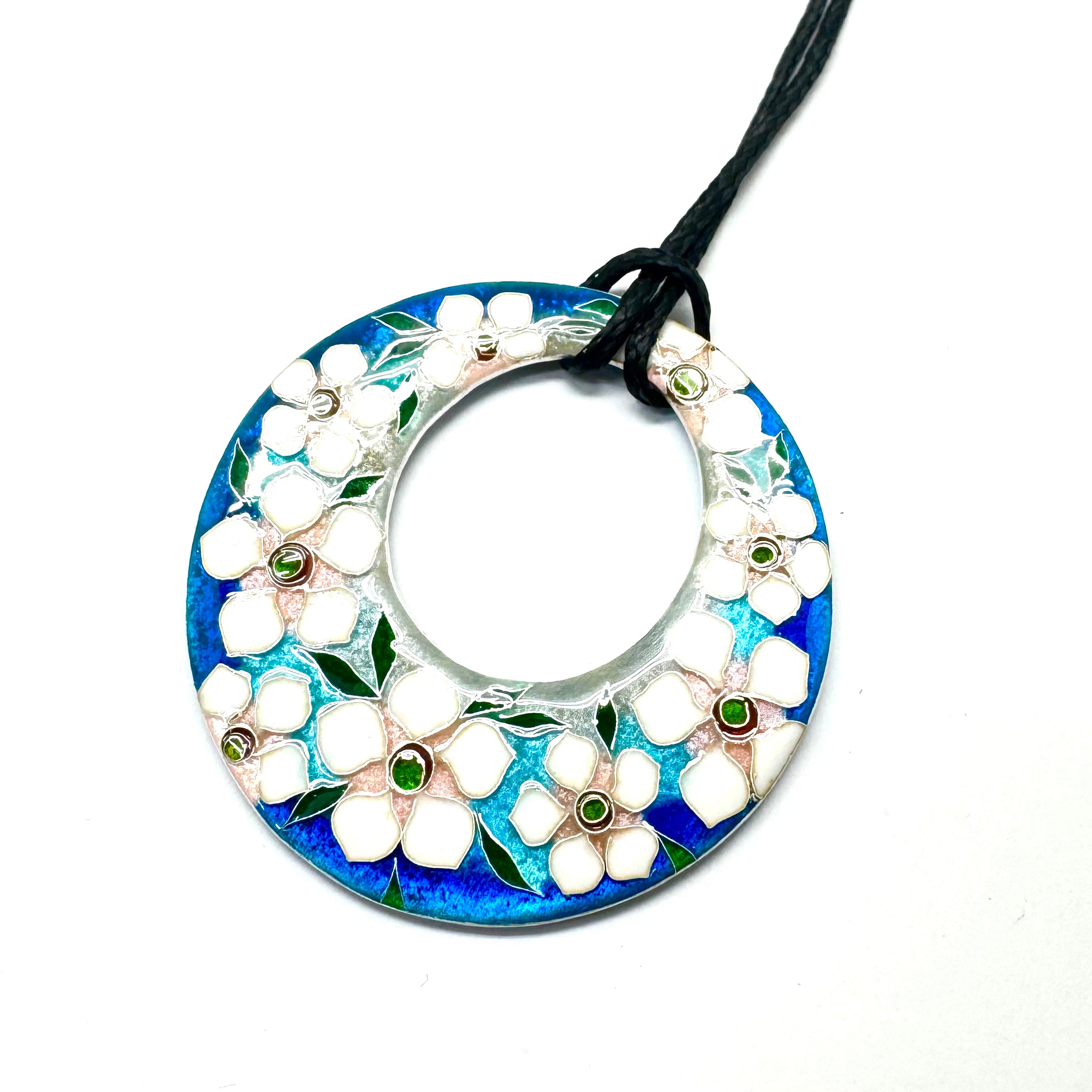 Fine silver and enamel Manuka flower ring pendant on black polyester cord