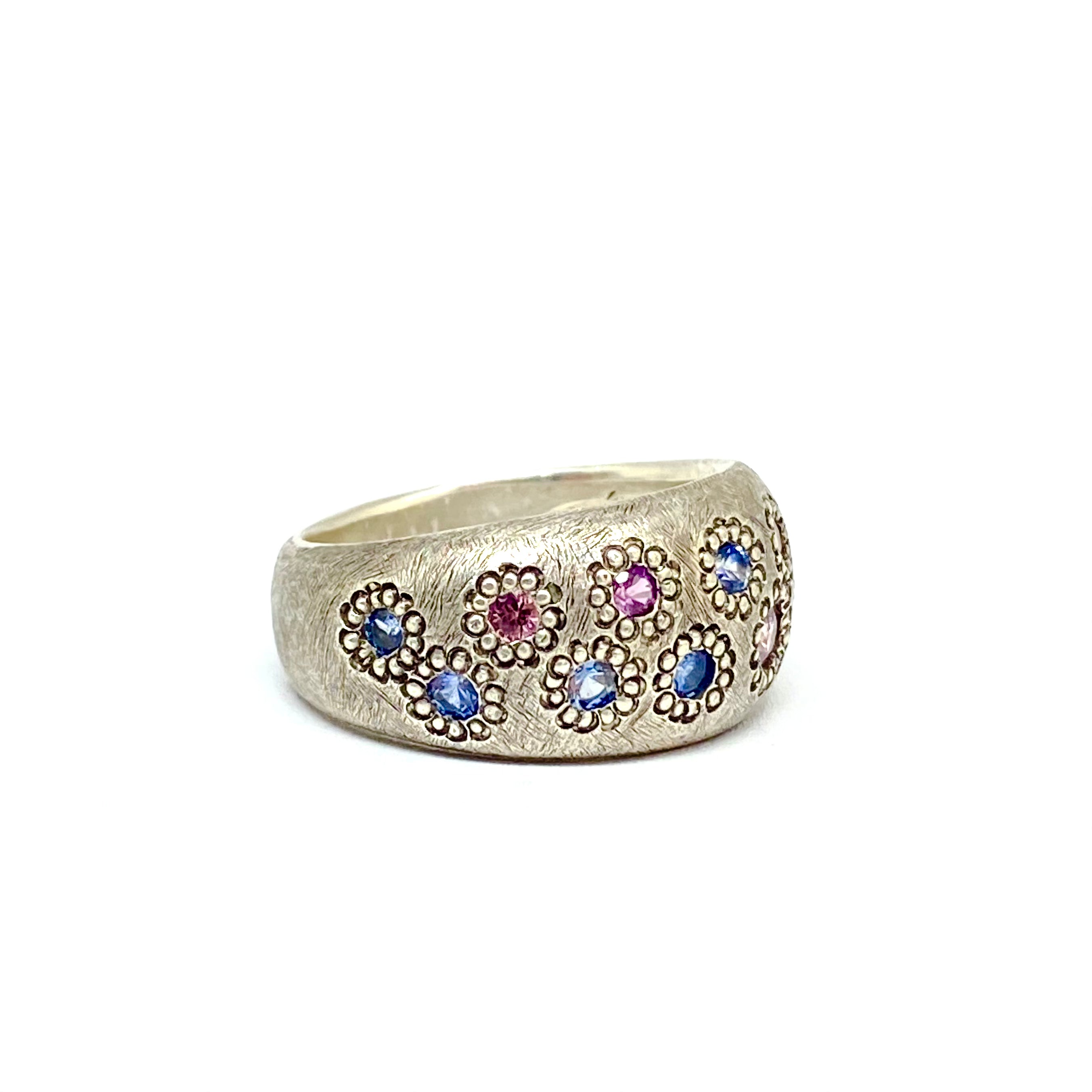 Stg Silver domed ring set with Blue and Pink Sapphires